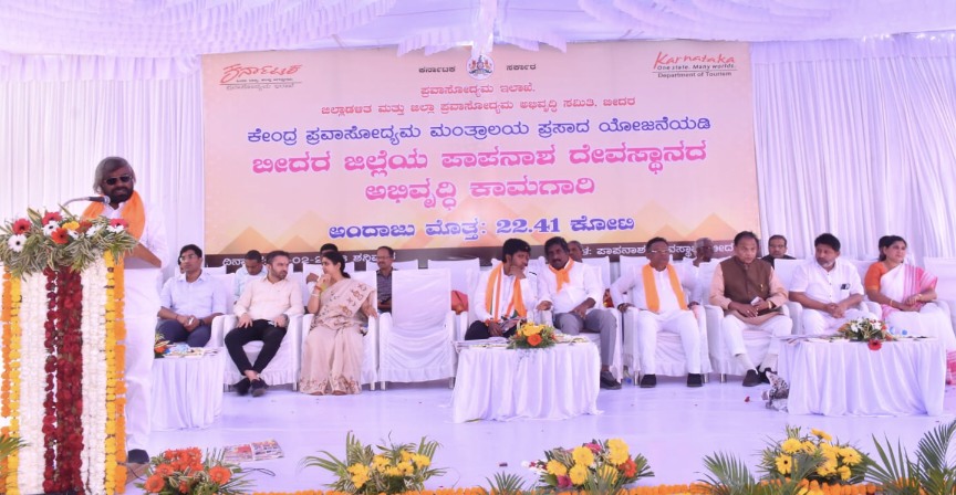 ಶನಿವಾರ ಕೇಂದ್ರ ಪ್ರವಾಸೋದ್ಯಮ ಮಂತ್ರಾಲಯ ಭಾರತ ಸರ್ಕಾರ, ಪ್ರವಾಸೋದ್ಯಮ ಇಲಾಖೆ ಕರ್ನಾಟಕ ಸರ್ಕಾರ, ಜಿಲ್ಲಾಡಳಿತ ಮತ್ತು ಜಿಲ್ಲಾ ಪ್ರವಾಸೋದ್ಯಮ ಅಭಿವೃದ್ಧಿ ಸಮಿತಿ ಬೀದರ ಕೇಂದ್ರ ಪ್ರವಾಸೋದ್ಯಮ ಮಂತ್ರಾಲಯ ಪ್ರಸಾದ ಯೋಜನೆಯಡಿಯಲ್ಲಿ 22.41 ಕೋಟಿ ರೂ. ವೆಚ್ಚದಲ್ಲಿ ಬೀದರ ಜಿಲ್ಲೆಯ ಪಾಪನಾಶ ದೇವಸ್ಥಾನದ ಅಭಿವೃದ್ಧಿ ಕಾಮಗಾರಿಗೆ ಚಾಲನೆ ನೀಡಿ ಮಾತನಾಡಿದರು.