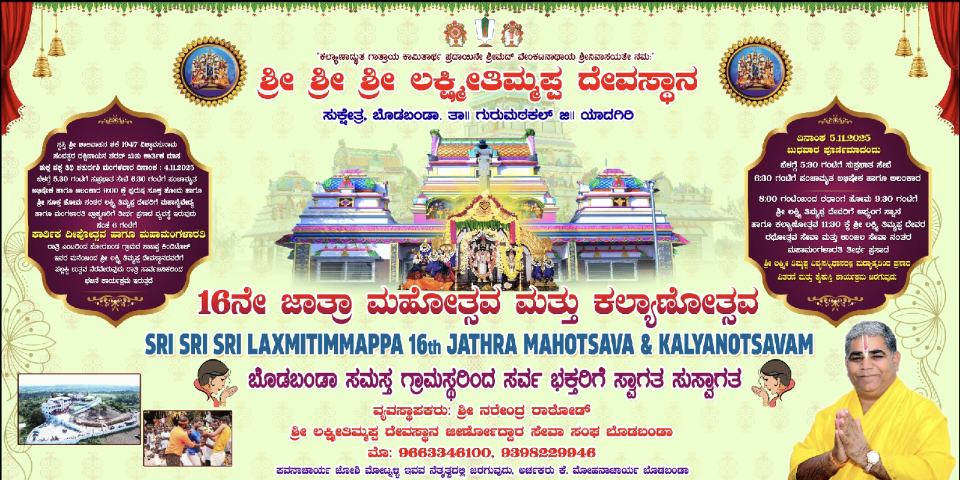 ಗುರುಮಠಕಲ್: ನ.4 ಮತ್ತು 5 ರಂದು ಶ್ರೀ ಲಕ್ಷ್ಮೀ ತಿಮ್ಮಪ್ಪ ಜಾತ್ರೆ, ಕಲ್ಯಾಣ ಉತ್ಸವ ಆಯೋಜಿಸಲಾಗಿದೆ ಎಂದು ದೇವಸ್ಥಾನ ಜೀರ್ಣೋದ್ದಾರ ಸಮಿತಿ ಪ್ರಮುಖ ಮಣಿಕಂಠ ರಾಠೋಡ ಹೇಳಿದರು. ತಾಲೂಕಿನ ಬೋರಬಂಡದ ಶ್ರೀ ಲಕ್ಷ್ಮೀ ತಿಮ್ಮಪ್ಪ ದೇವಸ್ಥಾನ ಆವರಣದಲ್ಲಿ ಮಾಧ್ಯಮದವರನ್ನುದ್ದೇಶಿ ಮಾತನಾಡಿದ ಅವರು, 2ನೇ ತಿರುಪತಿ ಎಂದು ಕರೆಯಲ್ಪಡುವ ಪವಿತ್ರ ಕ್ಷೇತ್ರದಲ್ಲಿ ವಿವಿಧ ಧಾರ್ಮಿಕ ಕಾರ್ಯಕ್ರಮಗಳು ಆಯೋಜಿಸಲಾಗಿದೆ ಎಂದು ತಿಳಿಸಿದರು.