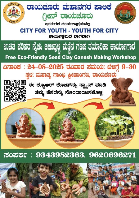 ರಾಯಚೂರು: ಮಹಾನಗರ ಪಾಲಿಕೆ ಹಾಗೂ ಗ್ರೀನ್ ರಾಯಚೂರು ಇವರ ಸಂಯುಕ್ತಾಶ್ರಯದಲ್ಲಿ ‘ಸಿಟಿ ಫಾರ್ ಯುಥ್ – ಯುಥ್ ಫಾರ್ ಸಿಟಿ’ ಕಾರ್ಯಕ್ರಮದ ಭಾಗವಾಗಿ ನಗರದಲ್ಲಿ ‘ಉಚಿತ ಪರಿಸರ ಪ್ರೇಮಿ ಬೀಜವುಳ್ಳ ಮಣ್ಣಿನ ಗಣಪ ತಯಾರಿಕಾ ಕಾರ್ಯಾಗಾರ’ವನ್ನು ಹಮ್ಮಿಕೊಳ್ಳಲಾಗಿದ್ದು, ವಯಸ್ಸಿನ ಬೇಧವಿಲ್ಲದೇ ಎಲ್ಲರೂ ಈ ಕಾರ್ಯಾಗಾರದಲ್ಲಿ ಭಾಗವಹಿಸಬಹುದಾಗಿದೆ.‌ ನಗರದ ಮಹಾತ್ಮಾಗಾಂಧಿ ಕ್ರೀಡಾಂಗಣದಲ್ಲಿ ಆ.24ರ (ರವಿವಾರ) ಬೆಳಿಗ್ಗೆ 9.30ಕ್ಕೆ ಪ್ರಾರಂಭವಾಗಲಿರುವ ಕಾರ್ಯಾಗಾರದಲ್ಲಿ ಮಹಾನಗರ ಪಾಲಿಕೆಯ ಅಧಿಕಾರಿಗಳು, ಗ್ರೀನ್ ರಾಯಚೂರು ಸಂಸ್ಥೆಯ ಪದಾಧಿಕಾರಿಗಳು, ವಿವಿಧ ಗಣ್ಯರನ್ನು ಒಳಗೊಂಡಂತೆ ಪರಿಸರ ಪ್ರೇಮಿಗಳು ಕಾರ್ಯಕ್ರಮದಲ್ಲಿ ಪಾಲ್ಗೊಳ್ಳಲಿದ್ದಾರೆ ಎಂದು ಮಹಾನಗರ ಪಾಲಿಕೆಯ ಆಯುಕ್ತರಾದ ಜುಬಿನ್ ಮೋಹಾಪಾತ್ರ ಪ್ರಕಟಣೆಯ ಮೂಲಕ ತಿಳಿಸಿದ್ದಾರೆ.