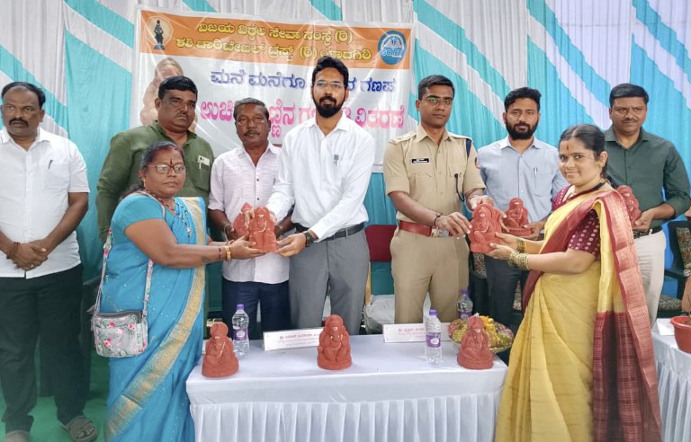 ಯಾದಗಿರಿ ನಗರದ ಹಿಂದಿ ಪ್ರಚಾರಸಭಾ ಆವರಣದಲ್ಲಿ ವಿಜಯ ವಿಠಲ ಸೇವಾ ಸಂಸ್ಥೆ ಹಾಗೂ ಶಶಿ ಚಾರಿಟೇಬಲ್ ಟ್ರಸ್ಟ್ ವತಿಯಿಂದ ಆಯೋಜಿಸಲಾಗಿದ್ದ “ಮನೆಮನೆಗೂ ಮಣ್ಣಿನ ಗಣಪ ಉಚಿತ ವಿತರಣೆ” ಕಾರ್ಯಕ್ರಮದಲ್ಲಿ ಮುಖ್ಯ ಅತಿಥಿಗಳಾಗಿ ಭಾಗವಹಿಸಿ, ಮಾತನಾಡಿದ ಅವರು ನಮ್ಮ ಮನೆಯಲ್ಲಿ ಆಚರಿಸುವ ಧಾರ್ಮಿಕ ಆಚರಣೆಗಳ ಮೂಲಕ ಪರಿಸರ ರಕ್ಷಣೆಯ ಕಾರ್ಯಕ್ಕೆ ಮುಂದಡಿ ಇಡುವ ಮೂಲಕ ಬದಲಾವಣೆಯ ಪರ್ವಕ್ಕೆ ನಮ್ಮ ನಮ್ಮ ಮನೆಗಳಿಂದಲೇ ಶ್ರೀಕಾರ ಹಾಕೋಣ ಎಂದು ಹೇಳಿದರು.